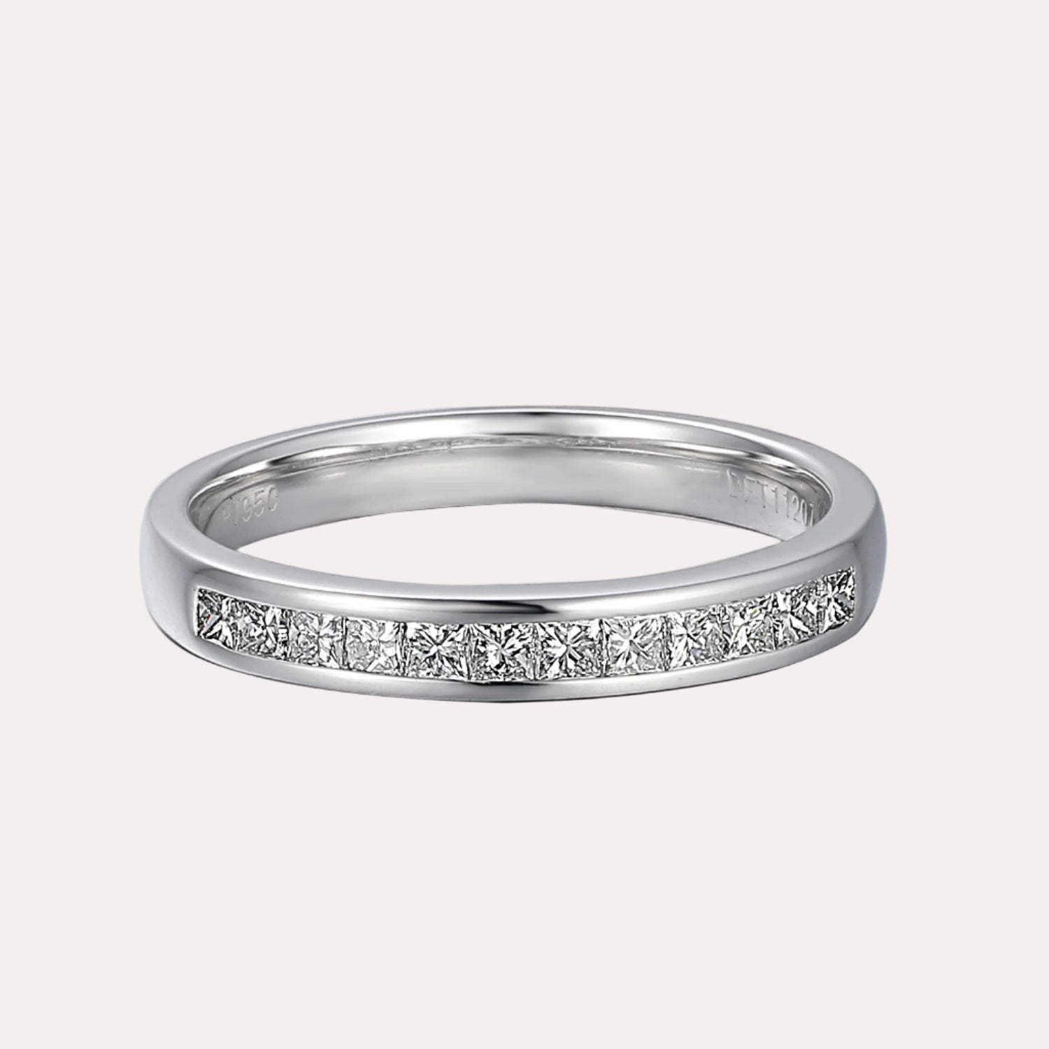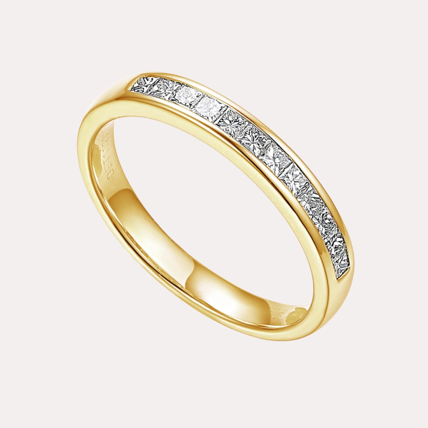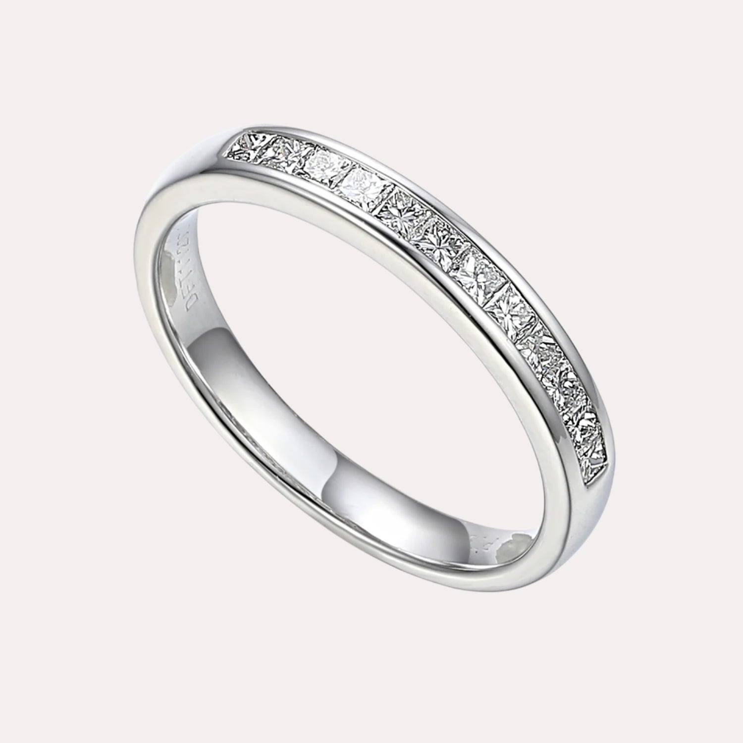 Princess Cut Diamond Channel Set Half Eternity ring featuring handpicked diamonds of G VS quality, set seamlessly for an elegant and enduring sparkle. A timeless piece to celebrate love, milestones, or add sophistication to everyday moments.