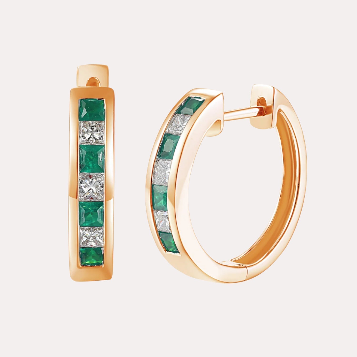 Channel Set Princess Cut Emerald & Diamond Hoop Earrings ring featuring handpicked 0.30ct diamonds of G VS quality. Designed to dazzle with refined charm, an ideal as a signature piece or meaningful gift.