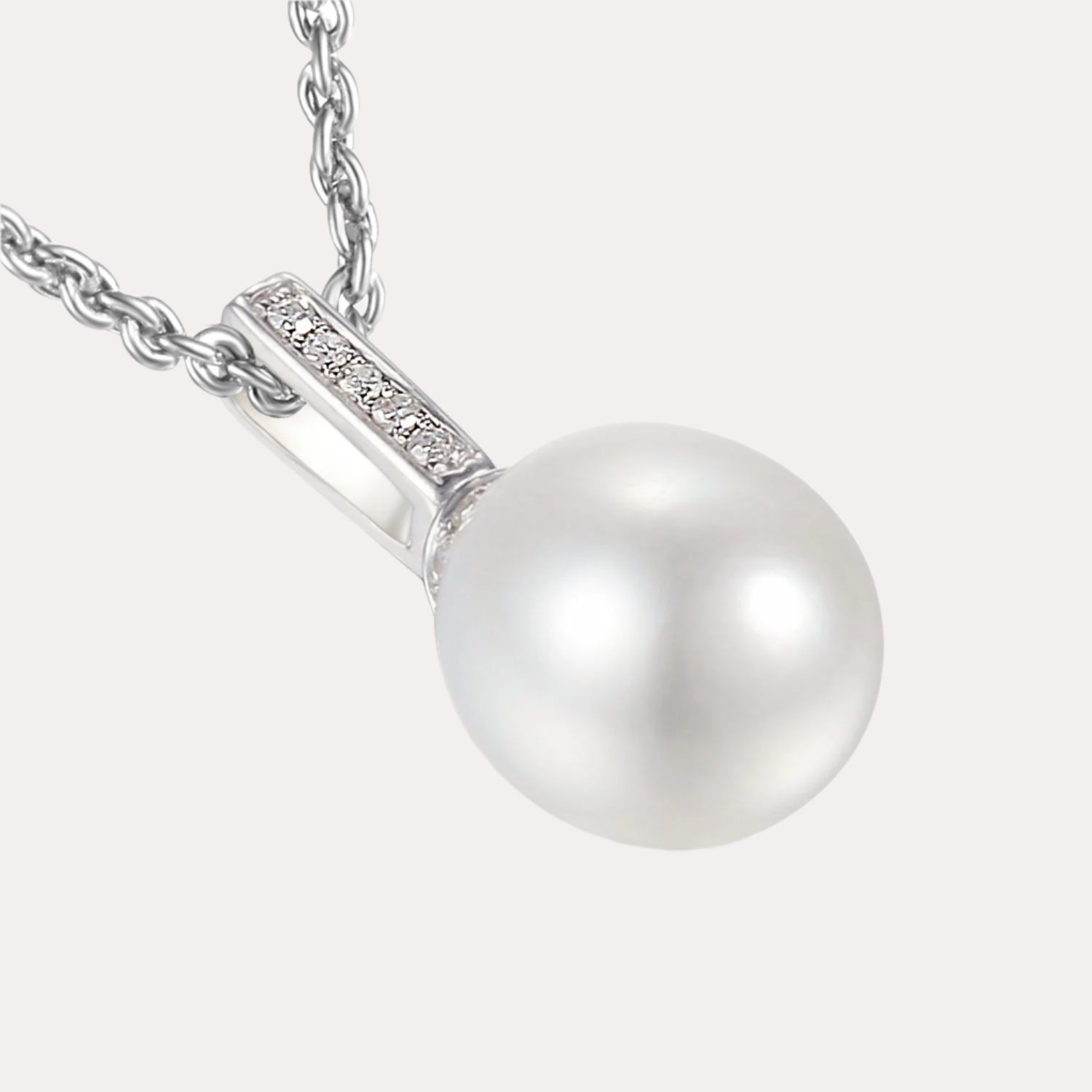 Micro Set Round Brilliant Cut Diamond And Pearl Drop Pendant featuring handpicked 0.04ct natural diamonds of G VS quality. Designed to dazzle with refined charm, an deal as a signature piece or meaningful gift.