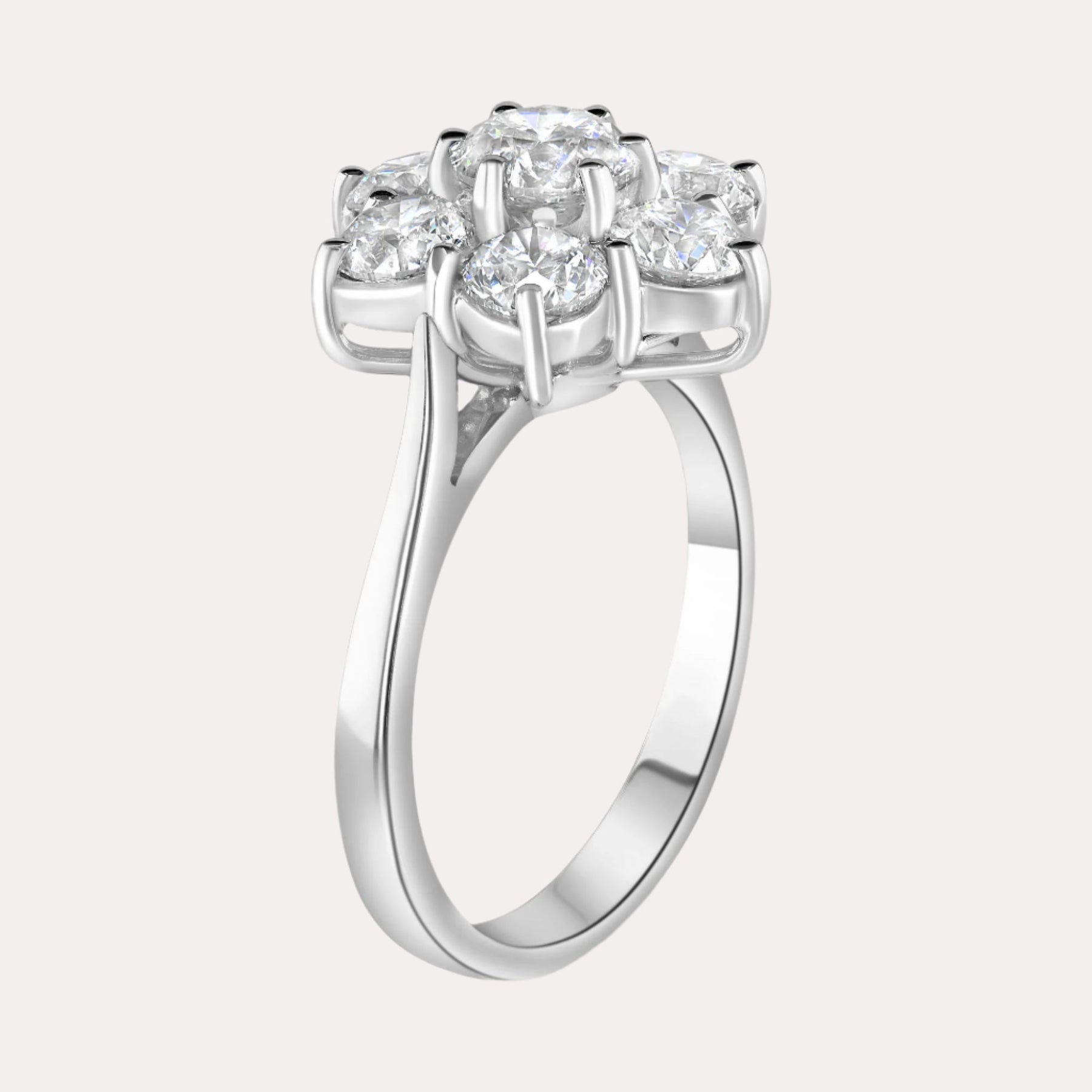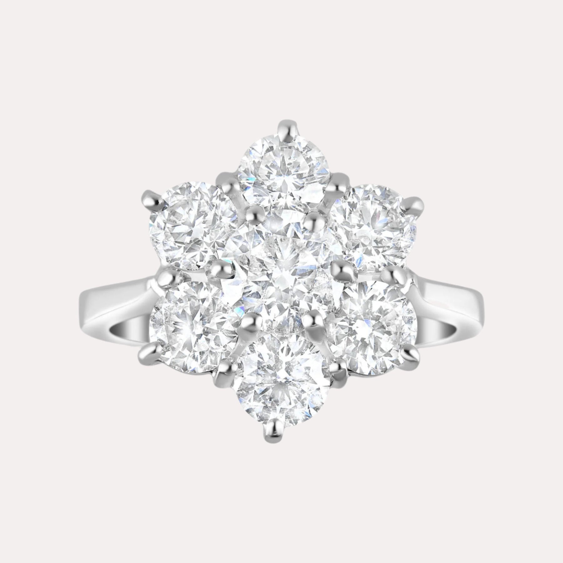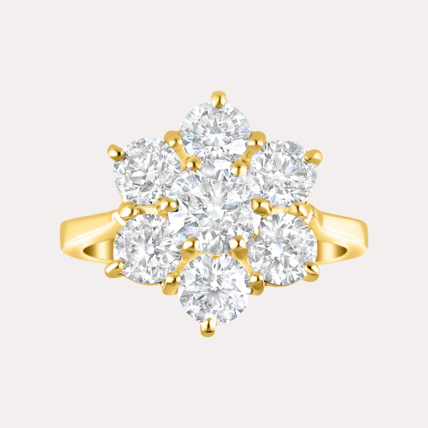 Daisy Cluster ring featuring handpicked gemstones of G VS quality. Designed to dazzle with refined charm, an ideal as a signature piece or meaningful gift.