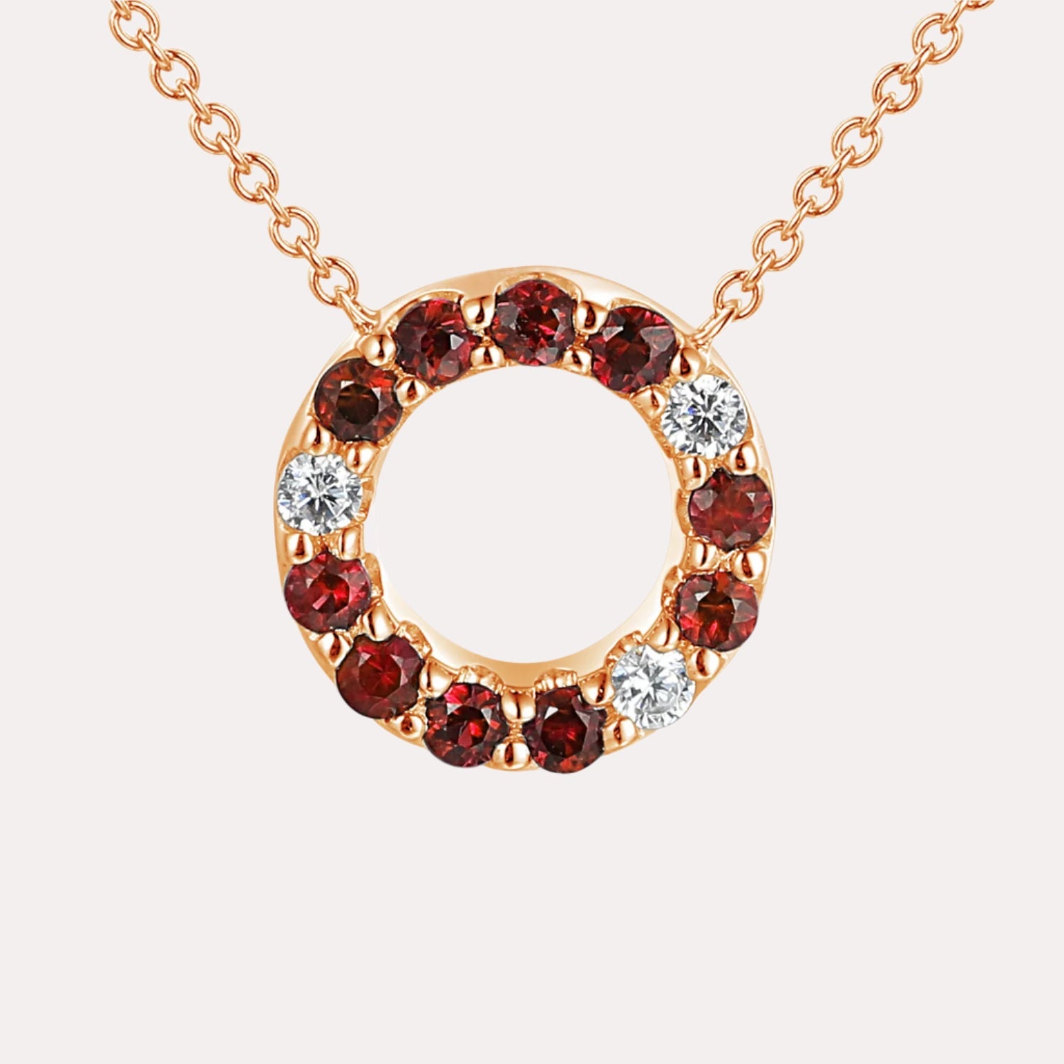 A delicate circle of vivid round ruby is accented by 0.06ct of micro set G VS quality natural diamonds in this elegant necklace. Symbolising unity and renewal, its the perfect fusion of colour, sparkle and refined enough for layering, striking enough to stand alone.