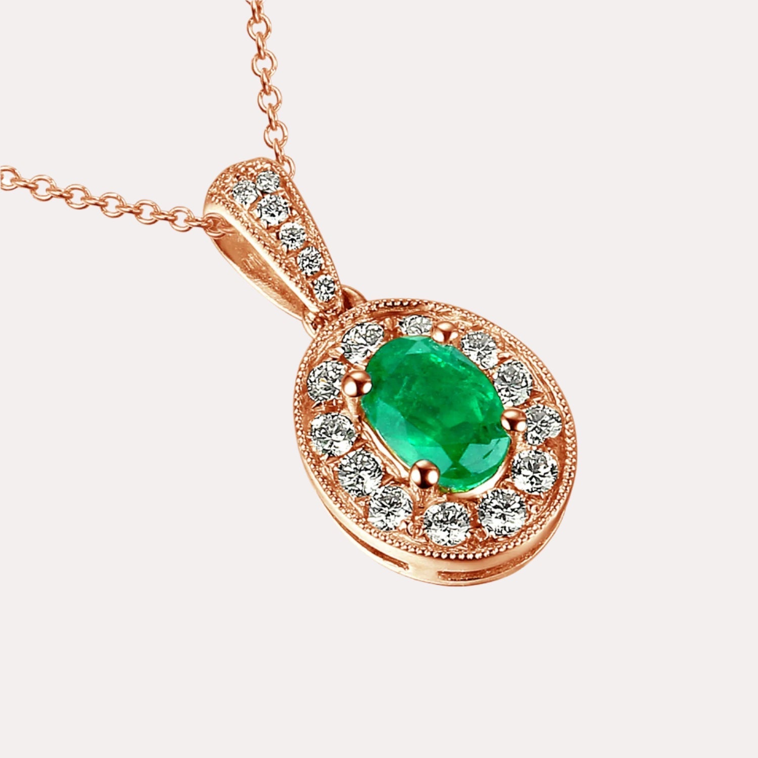 Claw Set Oval Cut Emerald Halo Pendant featuring handpicked high quality emerald & natural diamonds of total 0.26ct G VS quality. Designed to dazzle with refined charm, an ideal as a signature piece or meaningful gift.