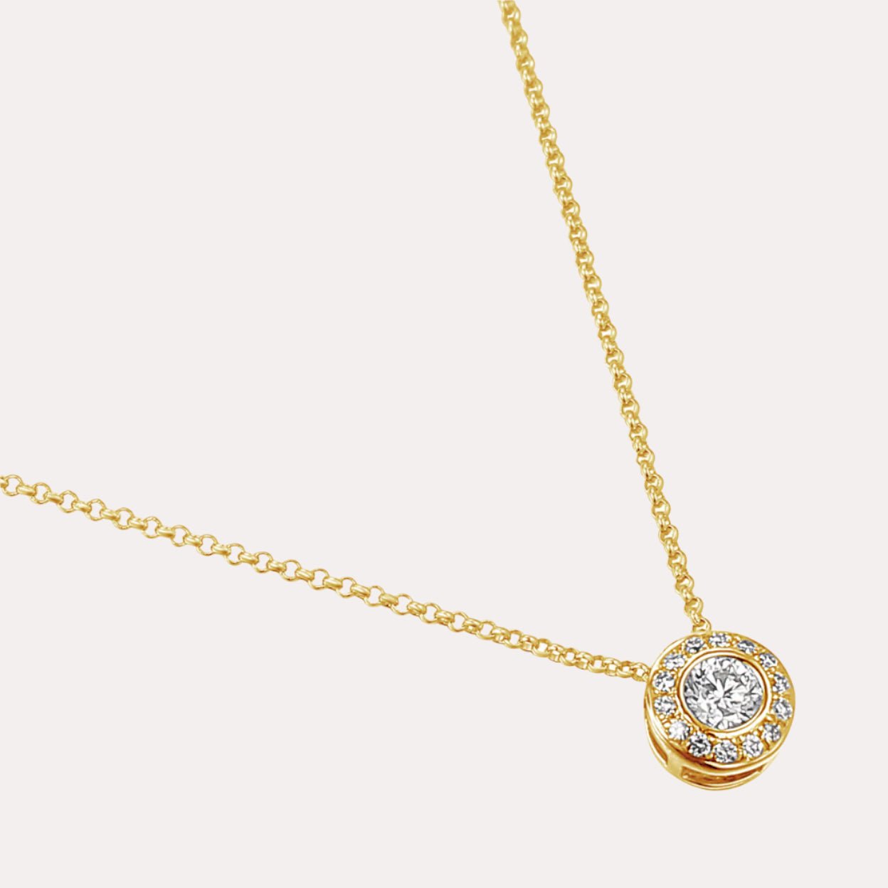 Round Brilliant Rubover Set Diamond Halo Pendant Necklace In 18K Gold