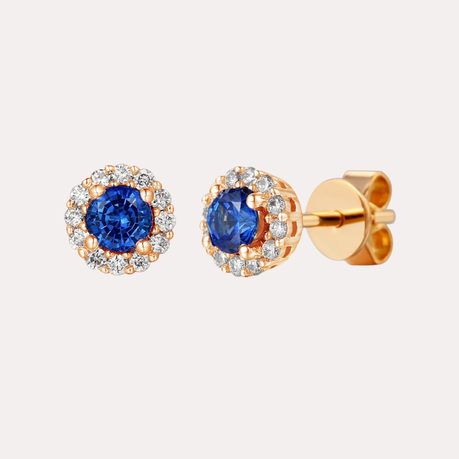 Claw & Micro Set Round Sapphire & Diamond Halo Stud Earrings ring featuring handpicked 0.15ct natural diamonds of G VS quality. Designed to dazzle with refined charm, an ideal as a signature piece or meaningful gift.