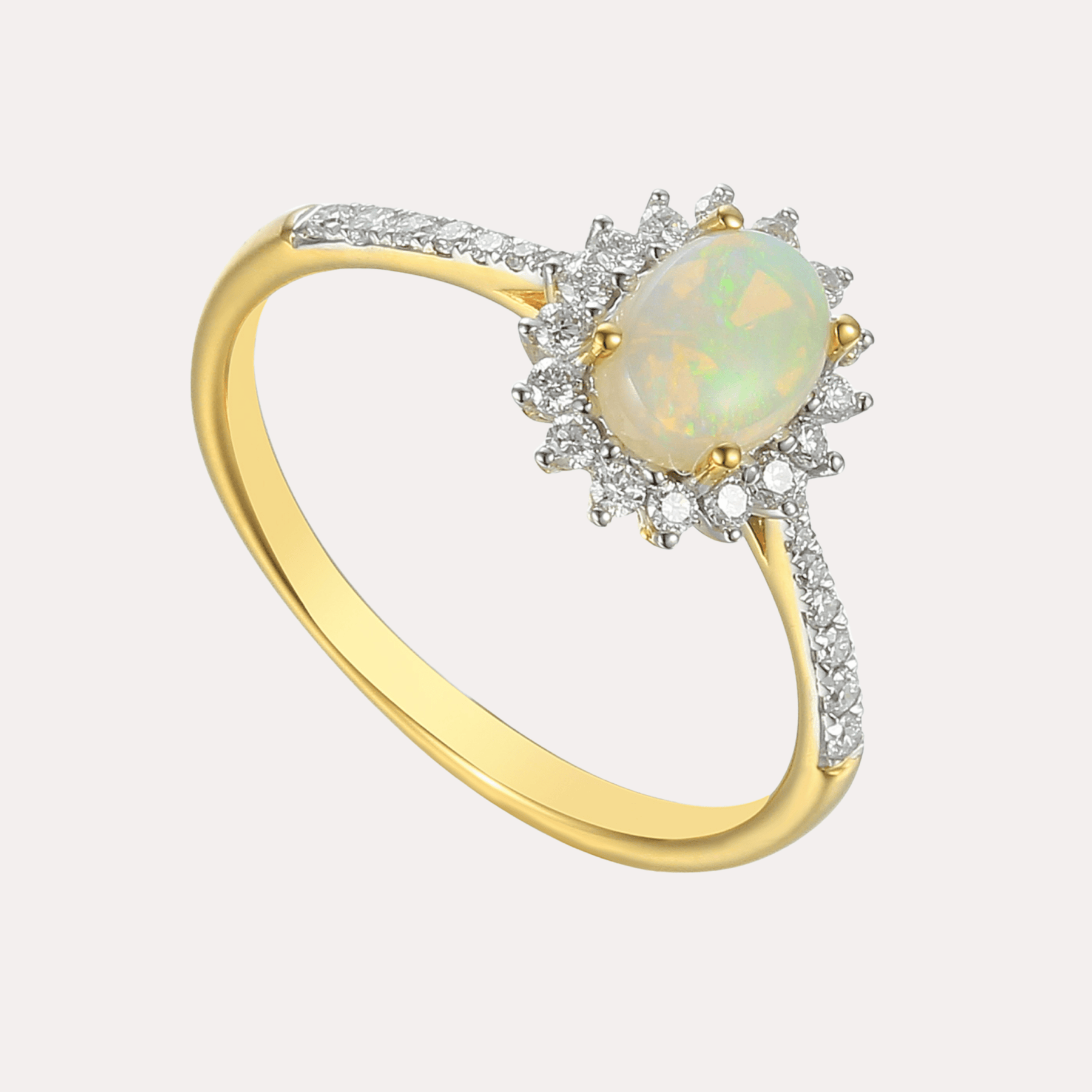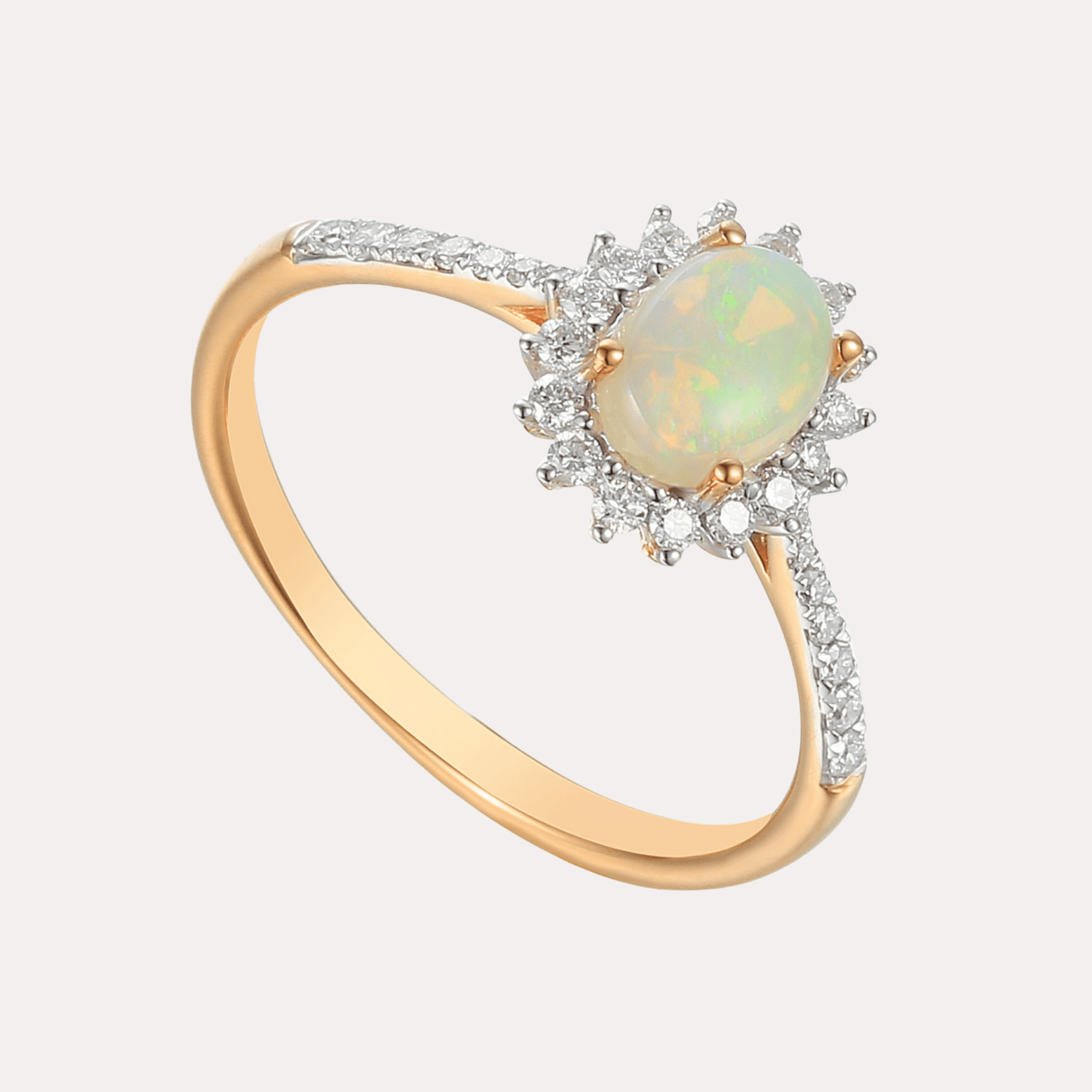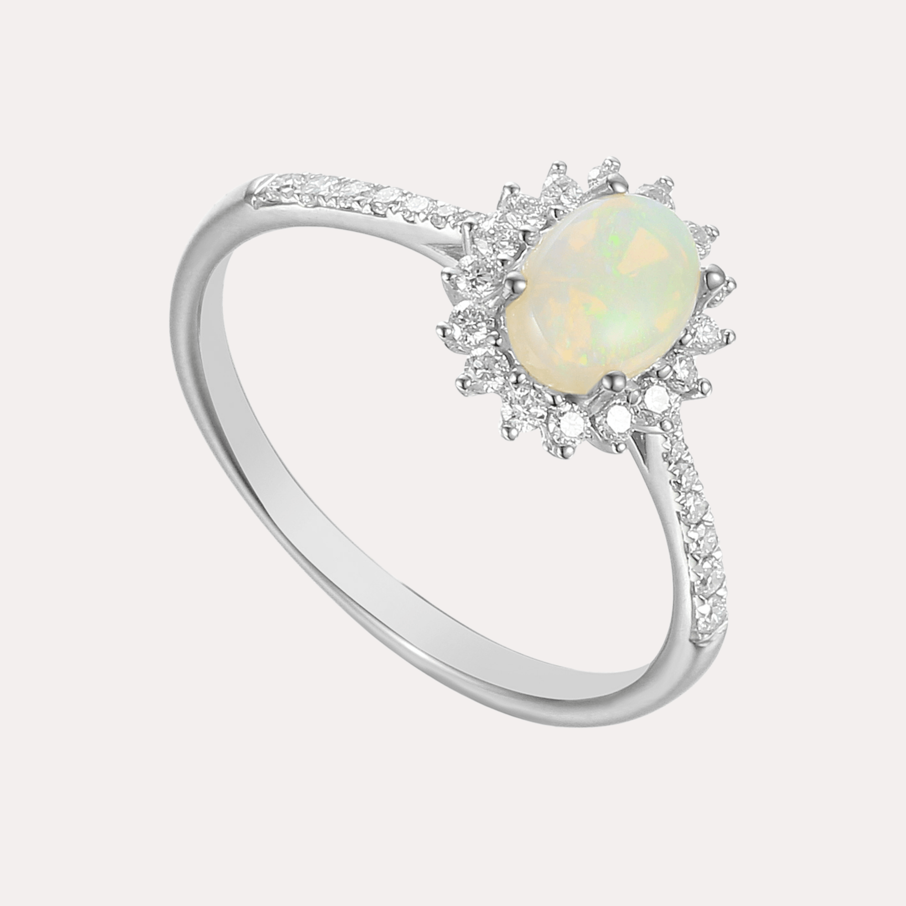 Round Diamond and Oval Opal Halo ring featuring handpicked natural 0.24ct diamonds of G VS quality. Designed to dazzle with refined charm, an ideal as a signature piece or meaningful gift.