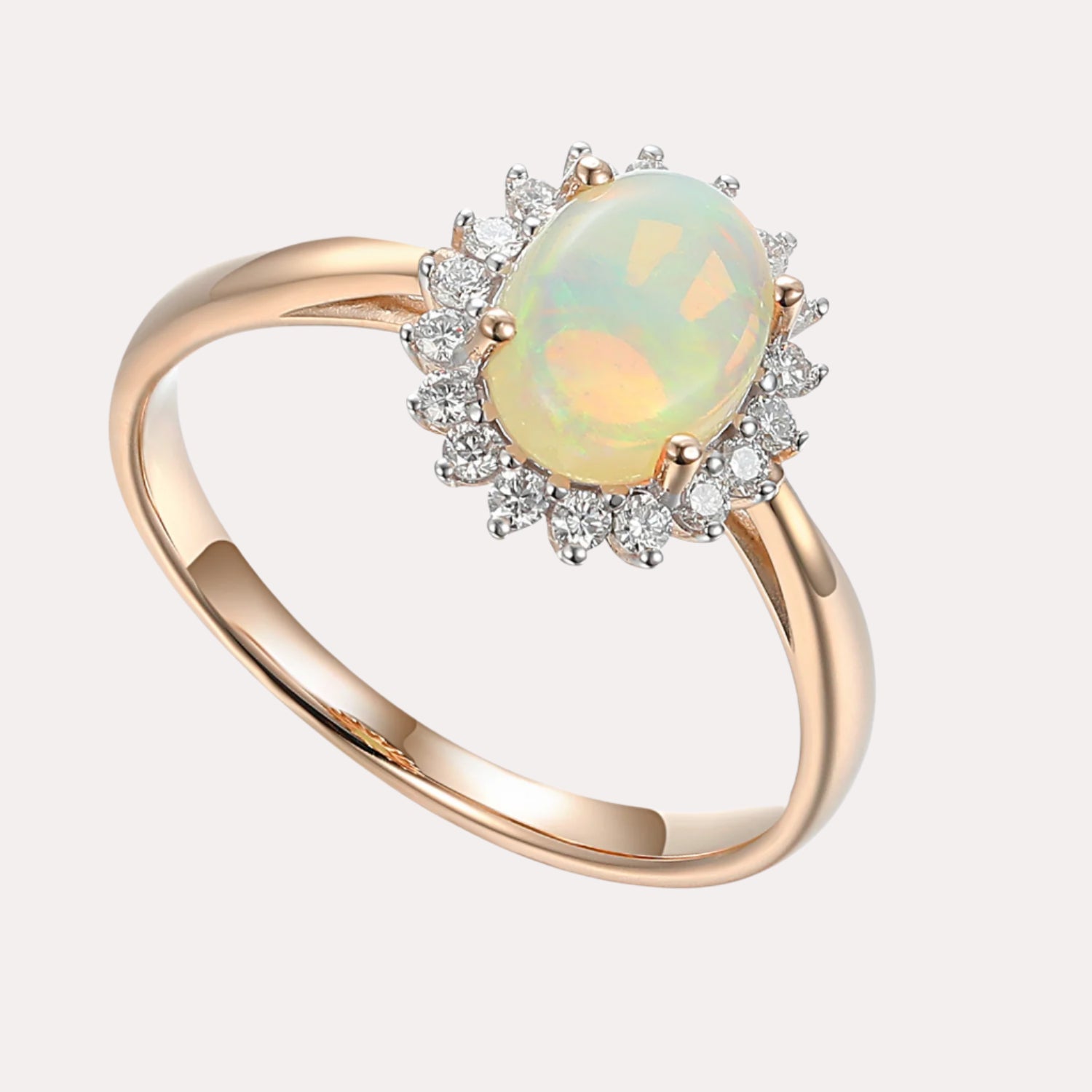 Round Diamond and Oval Opal Halo ring featuring handpicked natural 0.19ct diamonds of G VS quality. Designed to dazzle with refined charm, an ideal as a signature piece or meaningful gift.