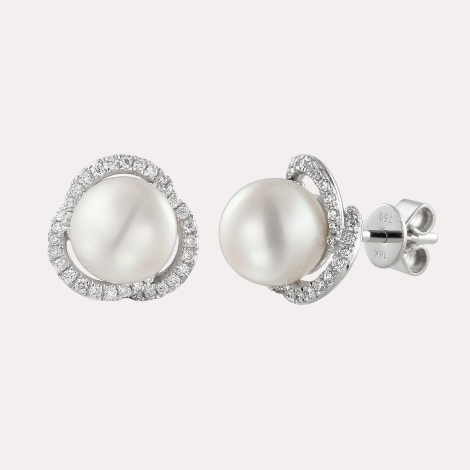 Elegance in every detail. These halo earrings feature luminous round pearls held in a delicate claw setting, framed by a circle of micro set 0.25ct total G VS quality Round Brilliant Cut Natural Diamonds. A timeless pairing of soft luster and sparkling brilliance. A perfect for weddings, gifting, or refined everyday wear.