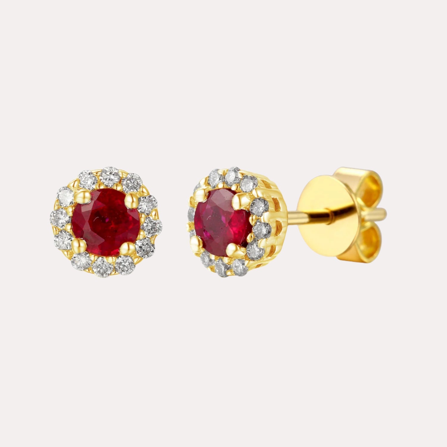Claw & Micro Set Round Ruby & Diamond Halo Stud Earrings ring featuring handpicked 0.15ct natural diamonds of G VS quality. Designed to dazzle with refined charm, an ideal as a signature piece or meaningful gift.