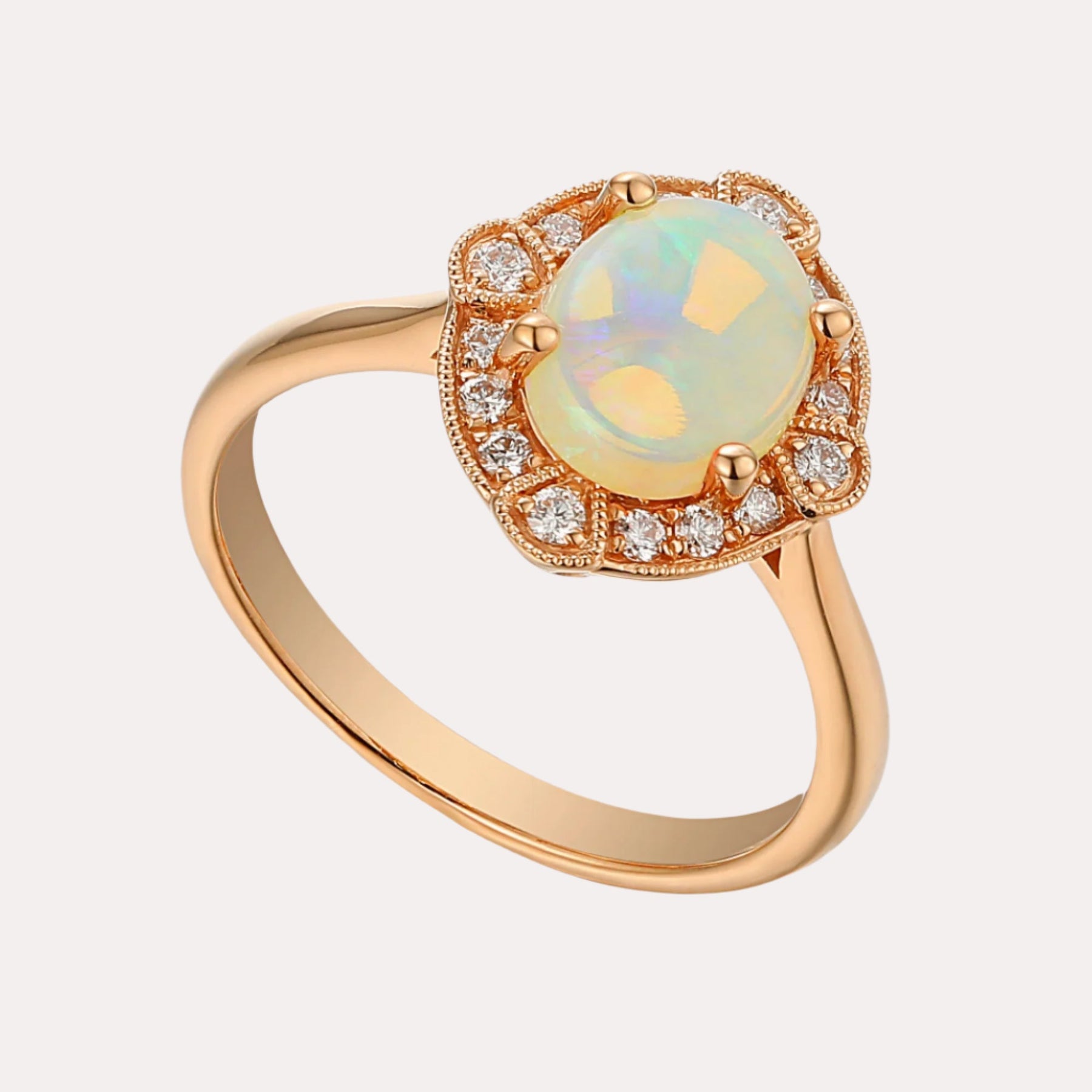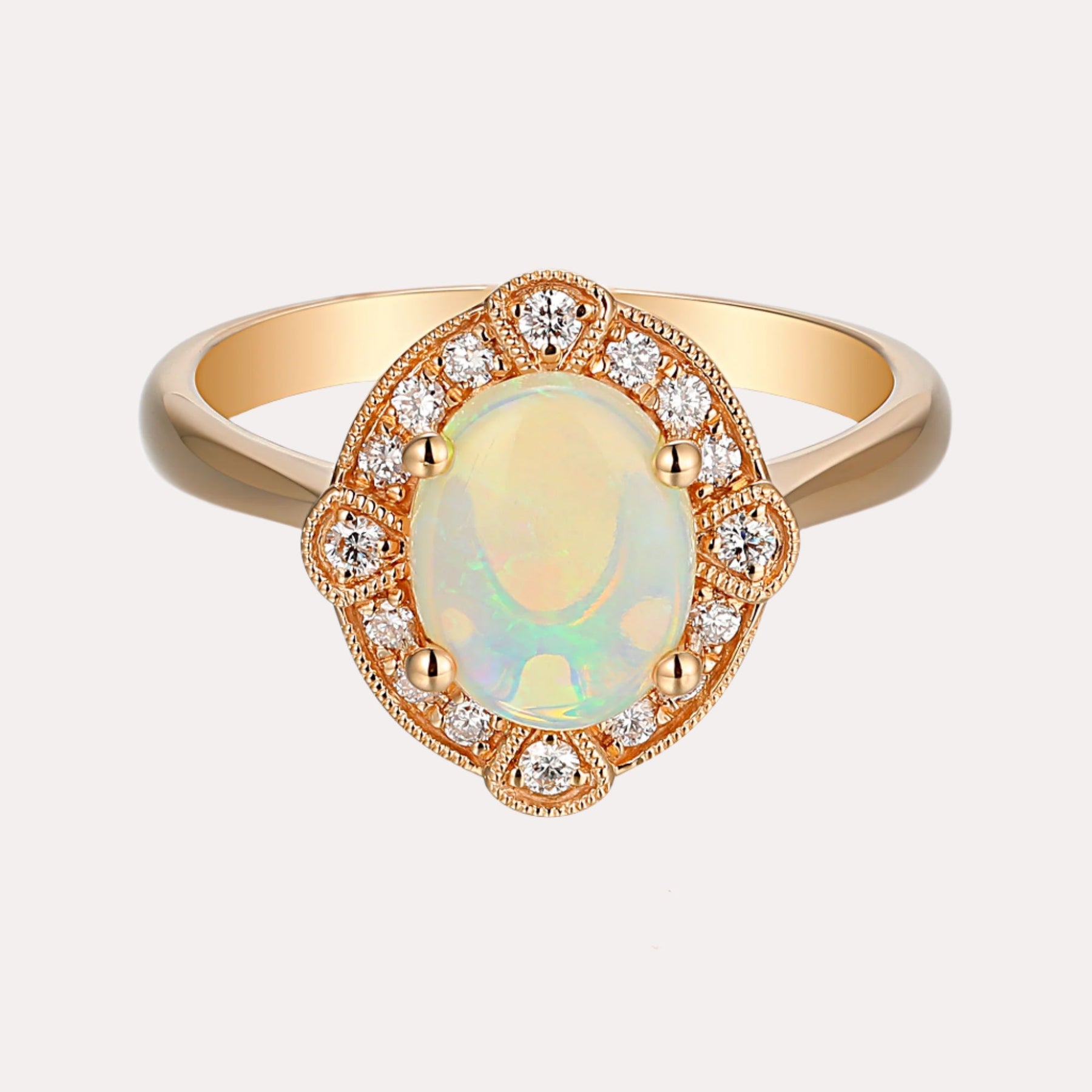 Oval Opal Halo ring featuring handpicked natural diamonds of 0.18ct total G VS quality. Designed to dazzle with refined charm, an ideal as a signature piece or meaningful gift.