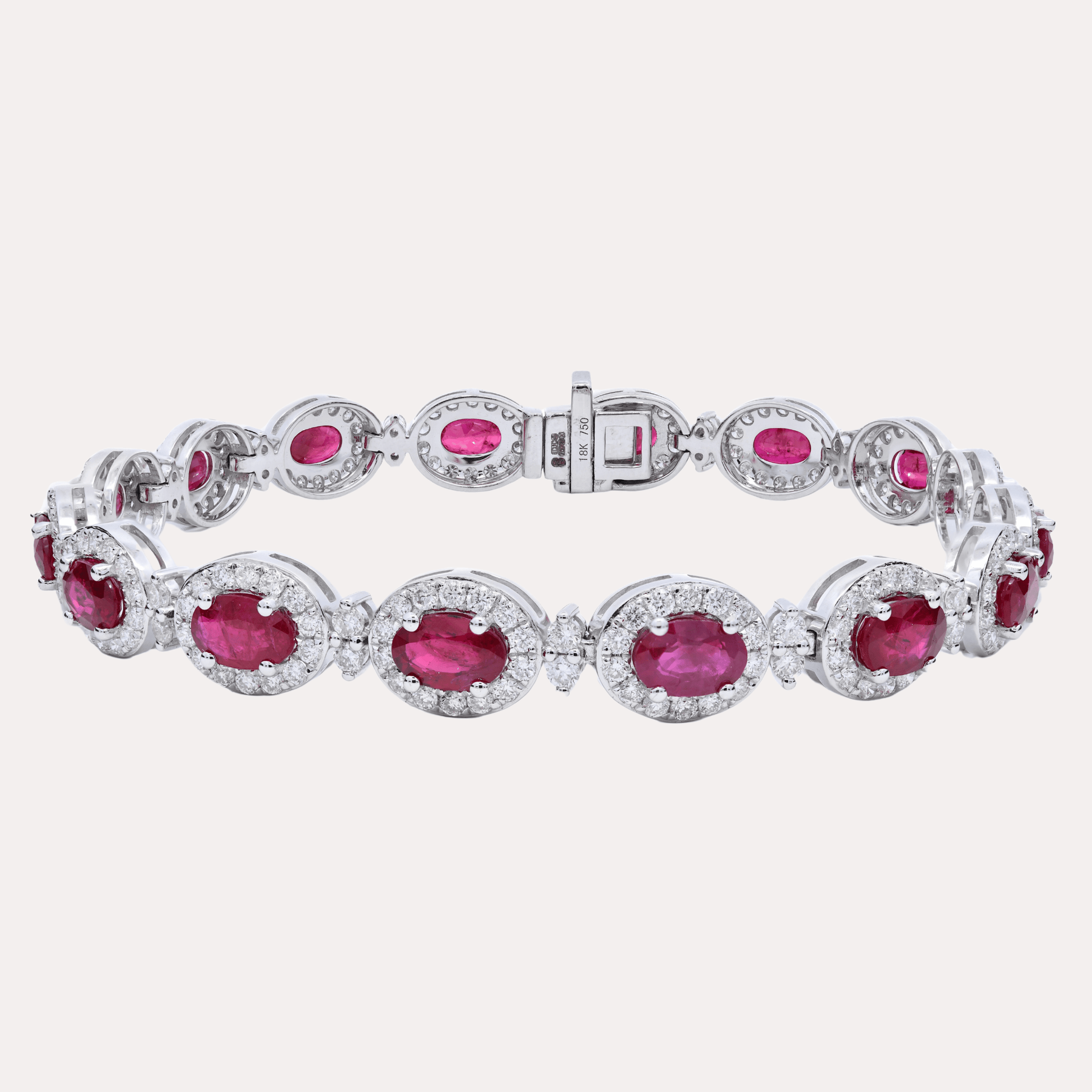 Micro Set Oval Cut Ruby & Diamond Halo Tennis Bracelet featuring handpicked natural diamonds of 3.32ct total G VS quality. Designed to dazzle with refined charm, an ideal as a signature piece or meaningful gift.