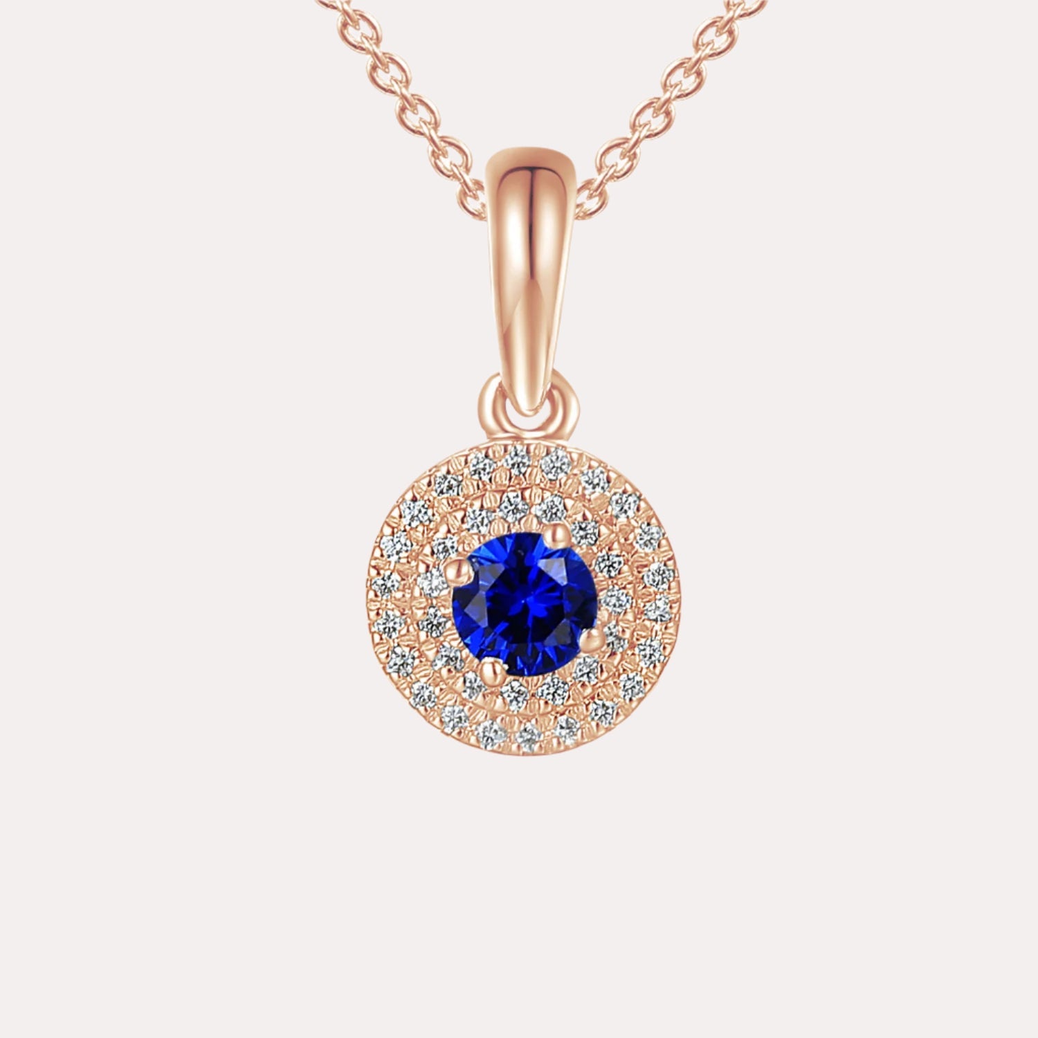 Round Brilliant Cut Blue Sapphire & Diamond Double Halo Pendant featuring handpicked 0.13ct diamonds of G VS quality. Designed to dazzle with refined charm, an ideal as a signature piece or meaningful gift.